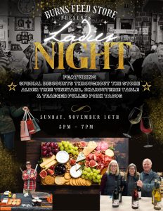 Join us for an evening of fun, shopping, and holiday cheer. Enjoy wine tasting with Alder Tree Winery, light refreshments and snacks, tacos cooked on the Traeger, and exclusive discounts throughout the store. The first 100 ladies will receive a special gift just for coming!