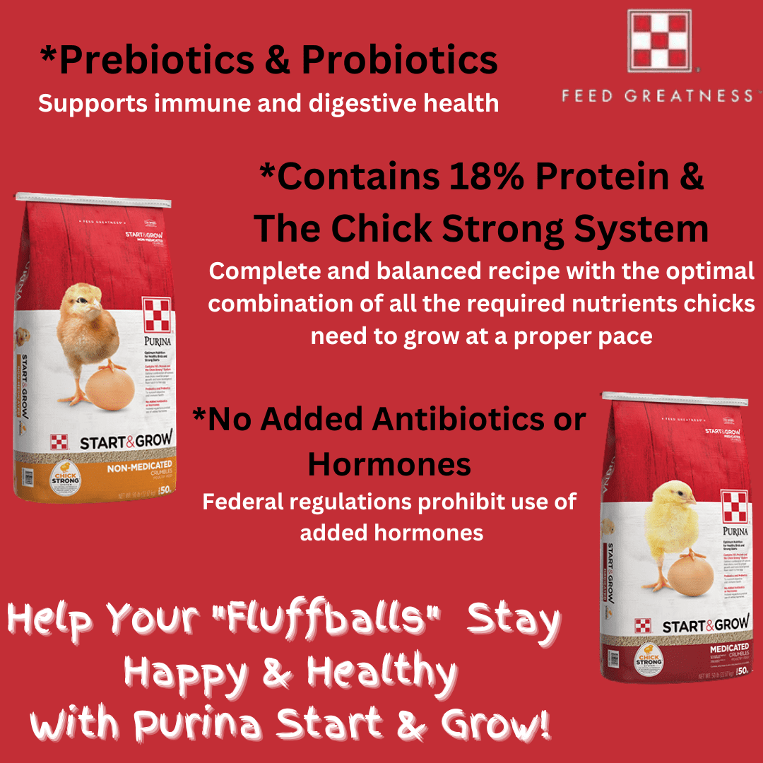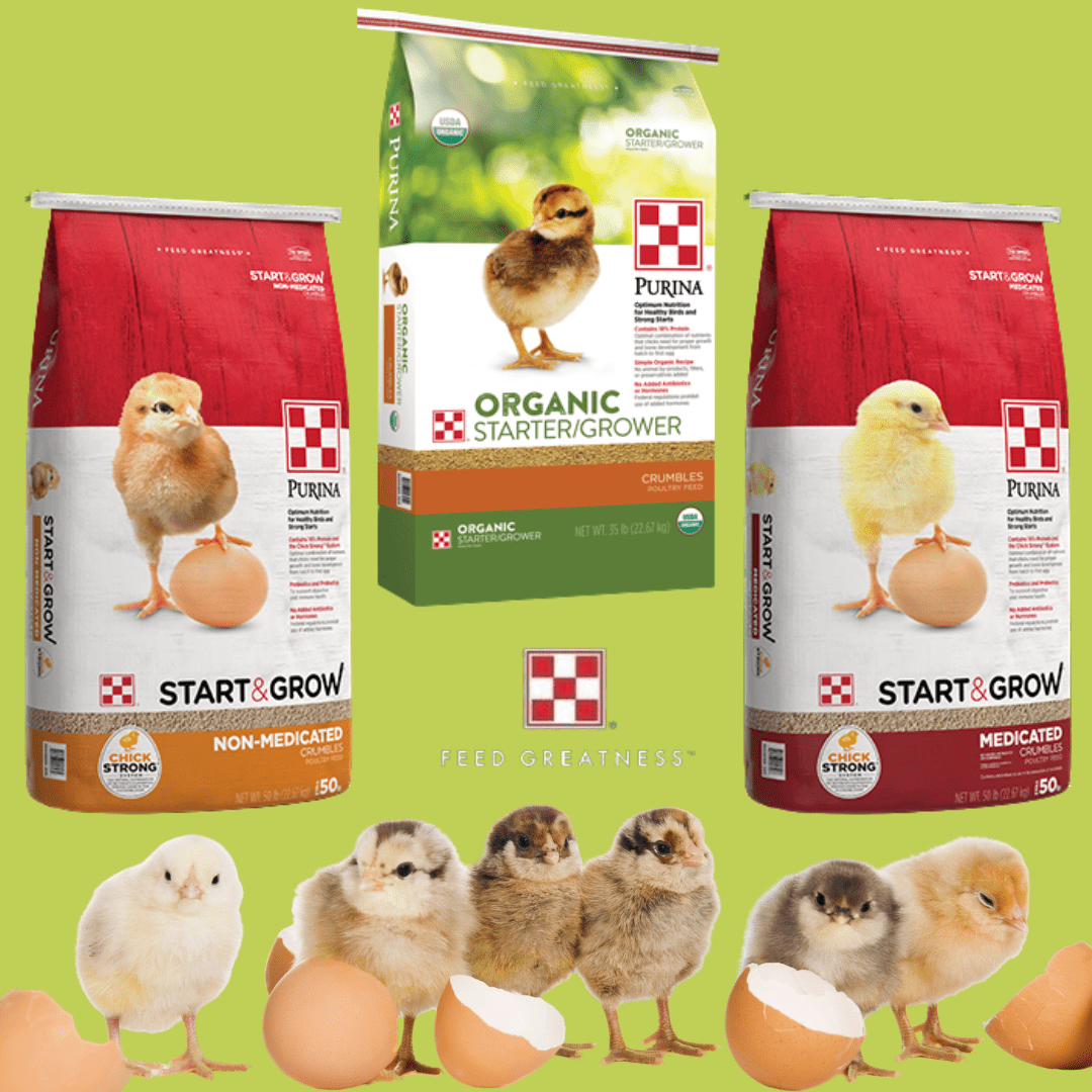Purina Start & Grow is specially formulated with the right balance of protein, amino acids, vitamins, and minerals to give chicks everything they need from hatch through their early growth stages. With Purina Start & Grow, you also have options between Medicated, Non-Medicated and Organic. All three of these products have the highest in quality ingredients and research-backed formulas so that you can feel confident your flock is getting the best possible start.